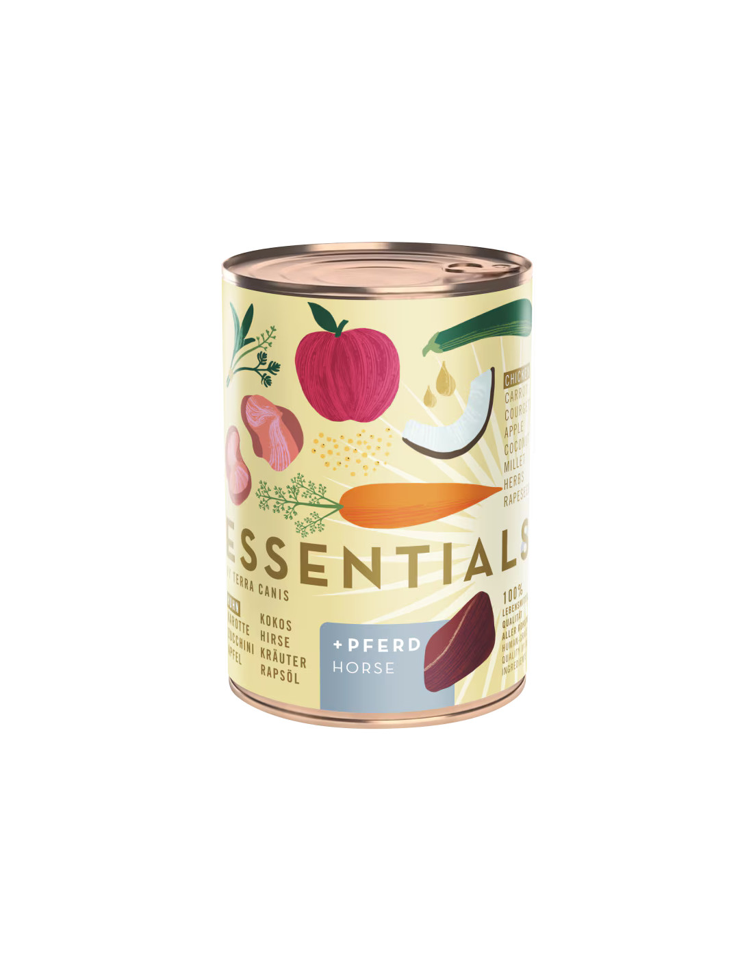 kurczak i konina 31% (żołądek kurczaka 15%, serce kurczaka 9%, mięso końskie 4%, wątróbka kurczaka 3%), bulion 23%, marchew 15%, cukinia 12%, proso 11%, jabłko 4%, olej rzepakowy 1%, minerały 1%*, mąka kokosowa 1%*, szałwia 0,2%*, trybula 0,2%*, tymianek 0,2%* *suszone